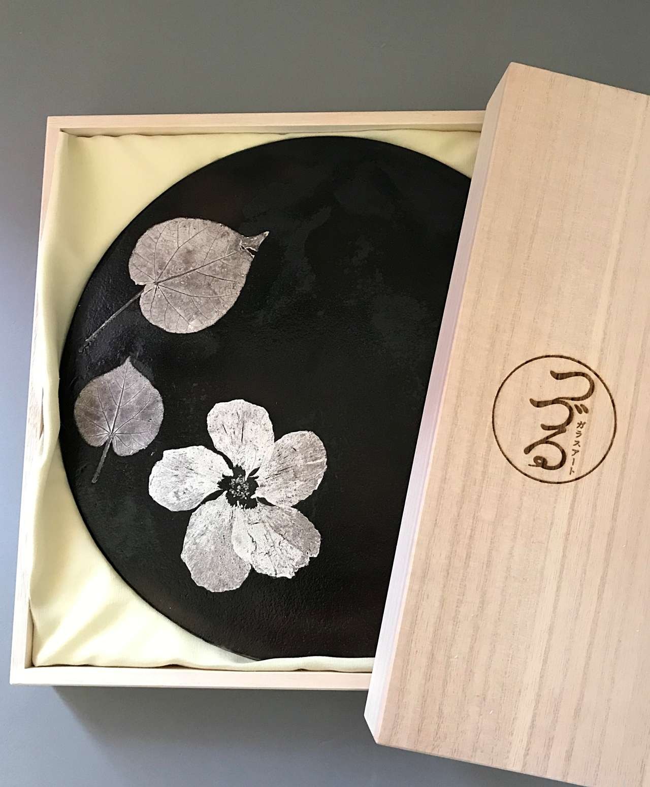 木箱にはレーザーで「つづるガラスアート」のロゴを焼き入れ、作品を大切に収めます。