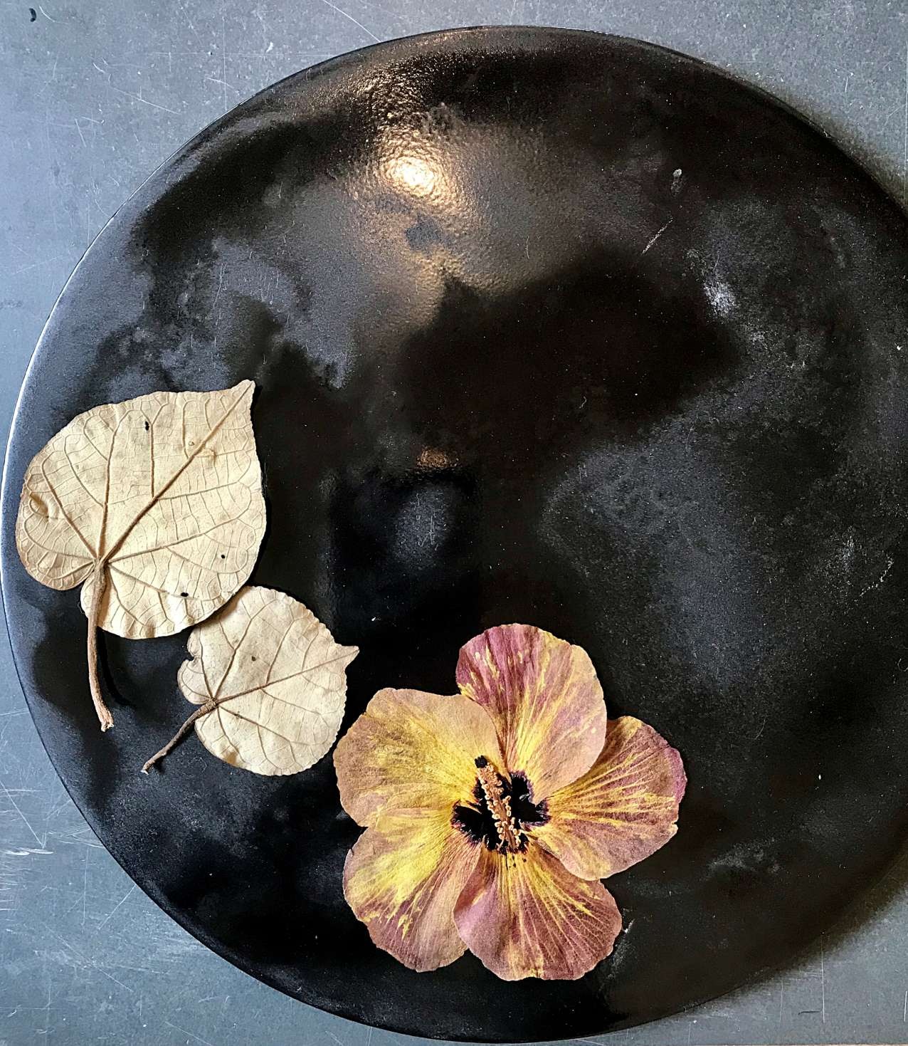 ゆうなの花と葉を黒いガラス皿にのせ、バランスを見ながら配置します。