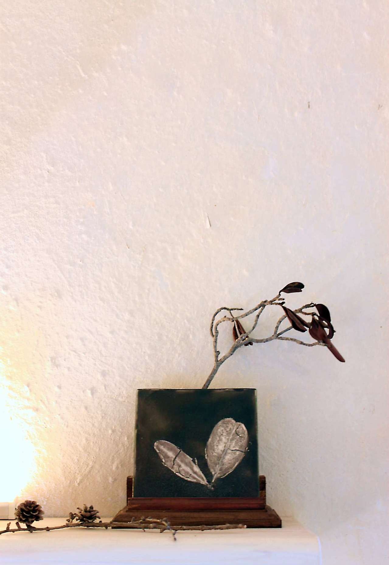 福木やオオバキの葉を焼き付けた壁掛け花器は、花を水を活けて壁に掛けて楽しむ逸品です。